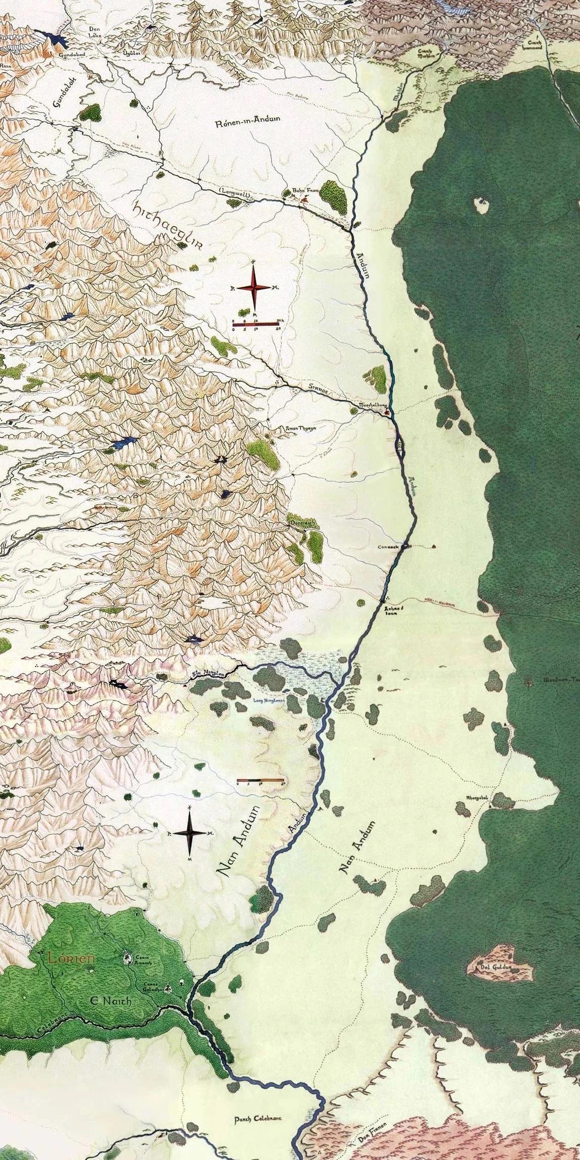 L'Anduin naît de la confluence de deux rivières : la Langwell, ainsi appelée par les Éothéod lorsqu'ils vivaient dans le triangle des terres formé entre les deux rivières, et le Greylin. L'ancienne capitale des Éothéod, Framsburg, a été construite au confluent de ces rivières, où commence l'Anduin proprement dit. La Langwell a sa source dans le nord des Monts Brumeux, près du mont Gundabad, et le Greylin commence dans l'ouest des Montagnes Grises.