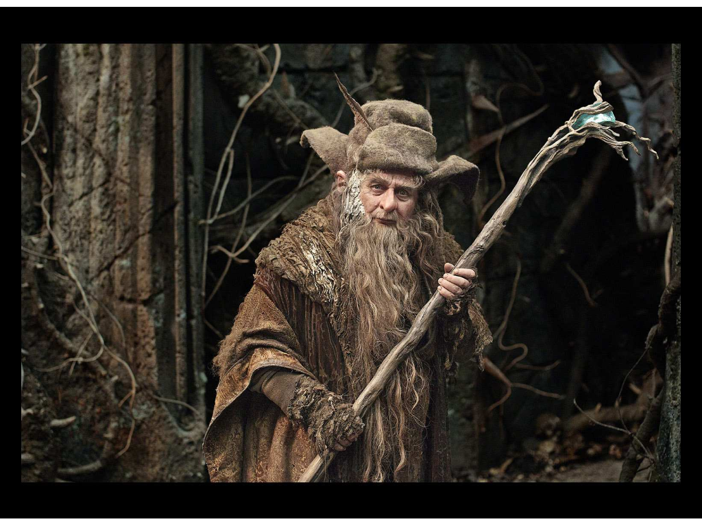 Radagast apparaît dans la trilogie du Hobbit. Son Bâton est en bois sombre, et à son extrémité partent des branches dans toutes les directions un peu comme sa coiffure. À son sommet est enchâssé un cristal bleu qu'il utilise pour soigner le hérisson Sébastien victime d'un maléfice.[22] Il va donner son Bâton à Gandalf qui part pour la Bataille des Cinq Armées, en le prévenant qu'il a un petit défaut et qu'il ne marche pas toujours très bien, ce que va constater Gandalf face à un Troll lors des combats.[23]