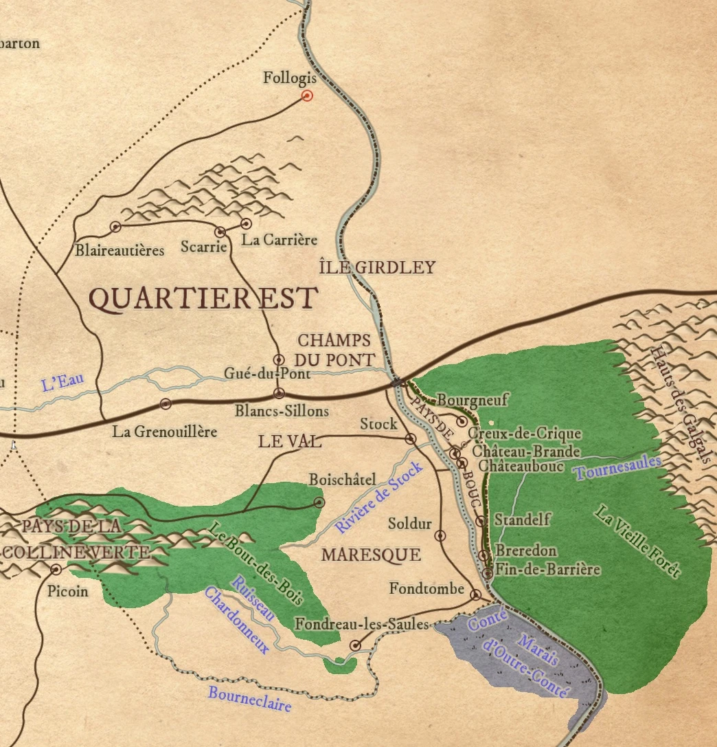 Situées dans la partie nord-est du Quartier Est de la Comté, elles sont spécifiquement localisées au sud de Follogis, au nord de La Carrière et de Scarrie, à l'ouest de Brandevin et à l'est des Blaireautières.[1]