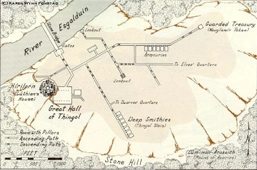 - ↑ Karen Wynn Fonstad, Atlas de la Terre du Milieu - Premier Âge, "Menegroth, les Mille Cavernes"