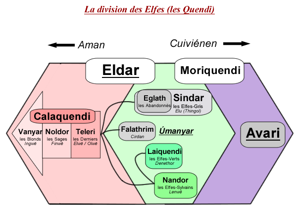 - Les Calaquendi appelèrent ces Elfes les Úmanyar, car ils n'atteignirent jamais le pays d'Aman, la terre bénie des Valar, et les Úmanyar comme les Avari étaient pour eux les Moriquendi, les Elfes de la Nuit, car ils n'avaient jamais vu la Lumière qui existait avant le Soleil et la Lune.