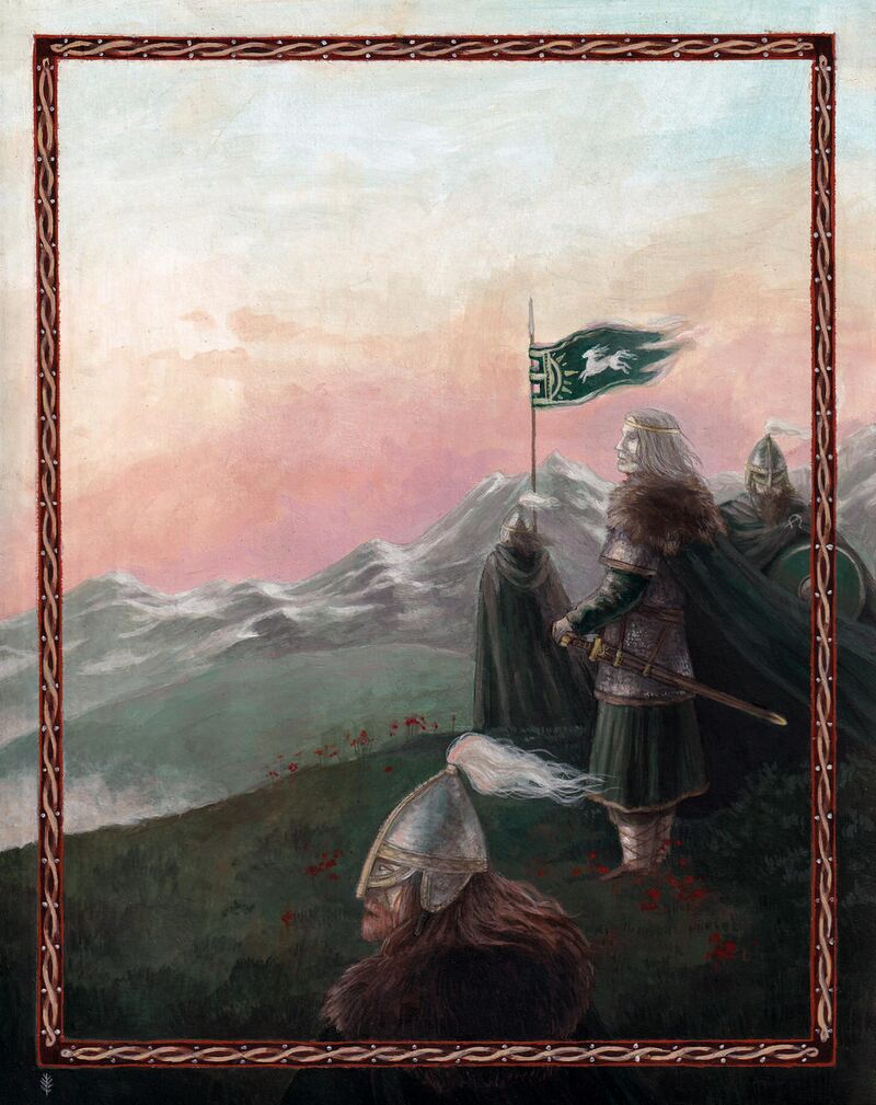 - Alors, un ménestrel et maître en tradition se leva et nomma tous les Seigneurs de la Marche dans l’ordre de leur succession : Eorl le Jeune ; et Brego le bâtisseur de la Salle ; et Aldor frère de Baldor le malheureux ; et Fréa, et Fréawine, et Goldwine, et Déor, et Gram ; et Helm qui se cacha dans la Gorge de Helm quand la Marche fut envahie ; et voilà qui acheva la série de neuf monticules du côté ouest, car à cette époque, la lignée fut rompue, et les tertres furent alors érigés du côté est : Fréaláf, fils de soeur de Helm, et Léofa, et Walda, et Folca, et Folcwine, et Fengel, et Thengel, et Théoden, le dernier à ce jour.