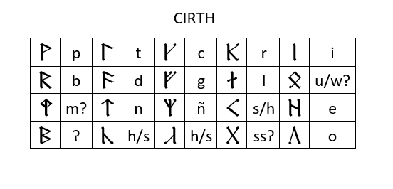 La tabella mostra la versione più vecchia del Cirth, che poi darà vita al Certhas Daeron[1].