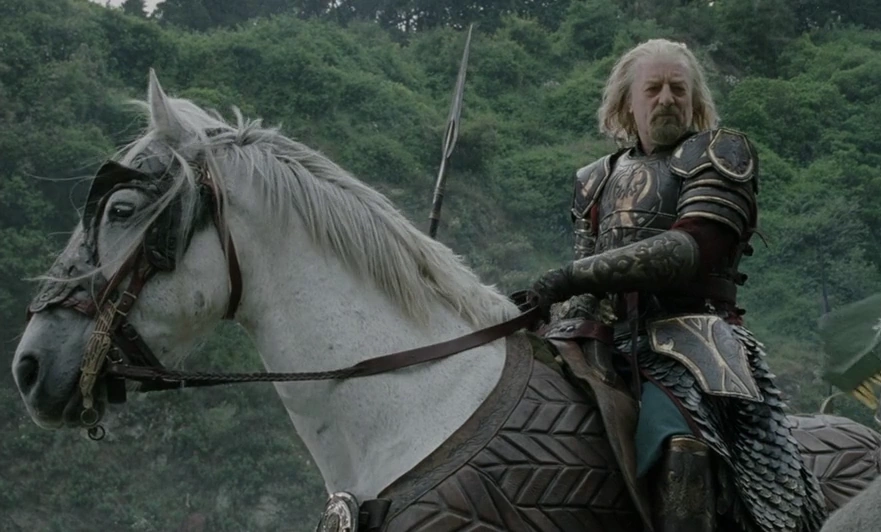 - "Ma ecco che all'improvviso, nel pieno della gloria, il re vide oscurarsi il suo scudo dorato. Il nuovo mattino fu come cancellato in cielo. L'oscurità li circondò nuovamente. I cavalli si misero a nitrire impennandosi. Uomini caduti di sella si agitavano per terra. "A me! A me!", gridò Théoden. "Coraggio, Eorlingas! Non temete l'oscurità!". Ma Nevecrino impazzito dal terrore s'impennò, lottando con l'aria, e poi con un terribile grido crollò sul fianco: una freccia nera l'aveva trafitto. Il re cadde sotto il cavallo."