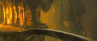 - "All'improvviso Frodo vide davanti a sé un baratro nero. In fondo al salone, il pavimento scompariva e piombava in un'ignota profondità. La porta esterna poteva essere raggiunta solo attraverso un sottile ponticello di pietra, senza parapetto o inferriata, che superava il baratro con un unico balzo di una quindicina di metri. [...] Potevano varcarlo solo in fila indiana. All'improvviso Gandalf si fermò e gli altri si stiparono dietro di lui."
