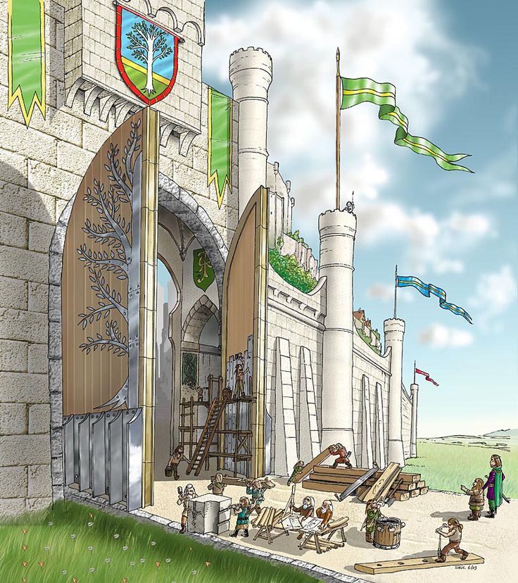 Gimli e Aragorn (in basso a destra) supervisionano gli artigiani di Erebor impegnati nel restauro di Minas Tirith dopo la Guerra dell'Anello