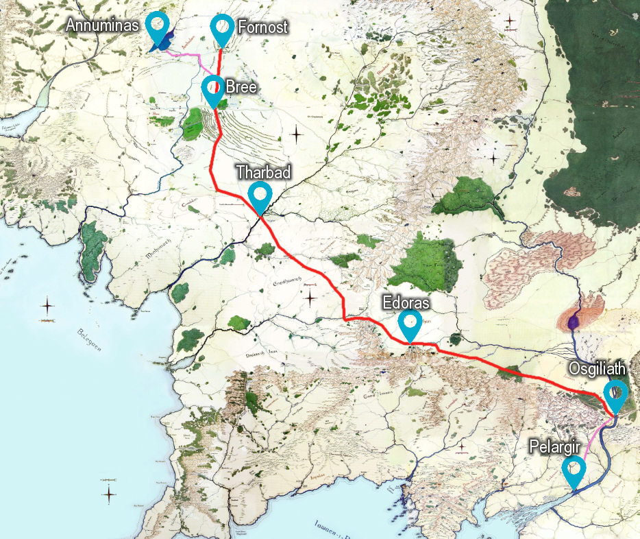 Patrząc od północy, gościniec rozpoczynał swój bieg w Fornoście[2]. Następnie zmierzał w kierunku południowym, by przeciąć się z Wielkim Gościńcem Wschodnim tuż przed Bree. Dalej na południowy-wschód przemierzał w Tharbadzie Szarą Wodę wielkim mostem i kierował się niemalże w linii prostej ku południowemu krańcowi Gór Mglistych. Tam skręcał na wschód i przechodził przez Wrota Rohanu, przecinając Isenę na tamtejszych brodach. Następnie wzdłuż Gór Białych ciągnął się ku Minas Tirith, przechodząc przez Edoras i pokonując graniczny strumień Mering. Z Miasta Królów biegł przez pola Pelennoru i ostatecznie kończył się w dawnej stolicy Gondoru – Osgiliath. Teoretycznie można do tego gościńca zaliczyć też odcinek do portów w Pelargirze.