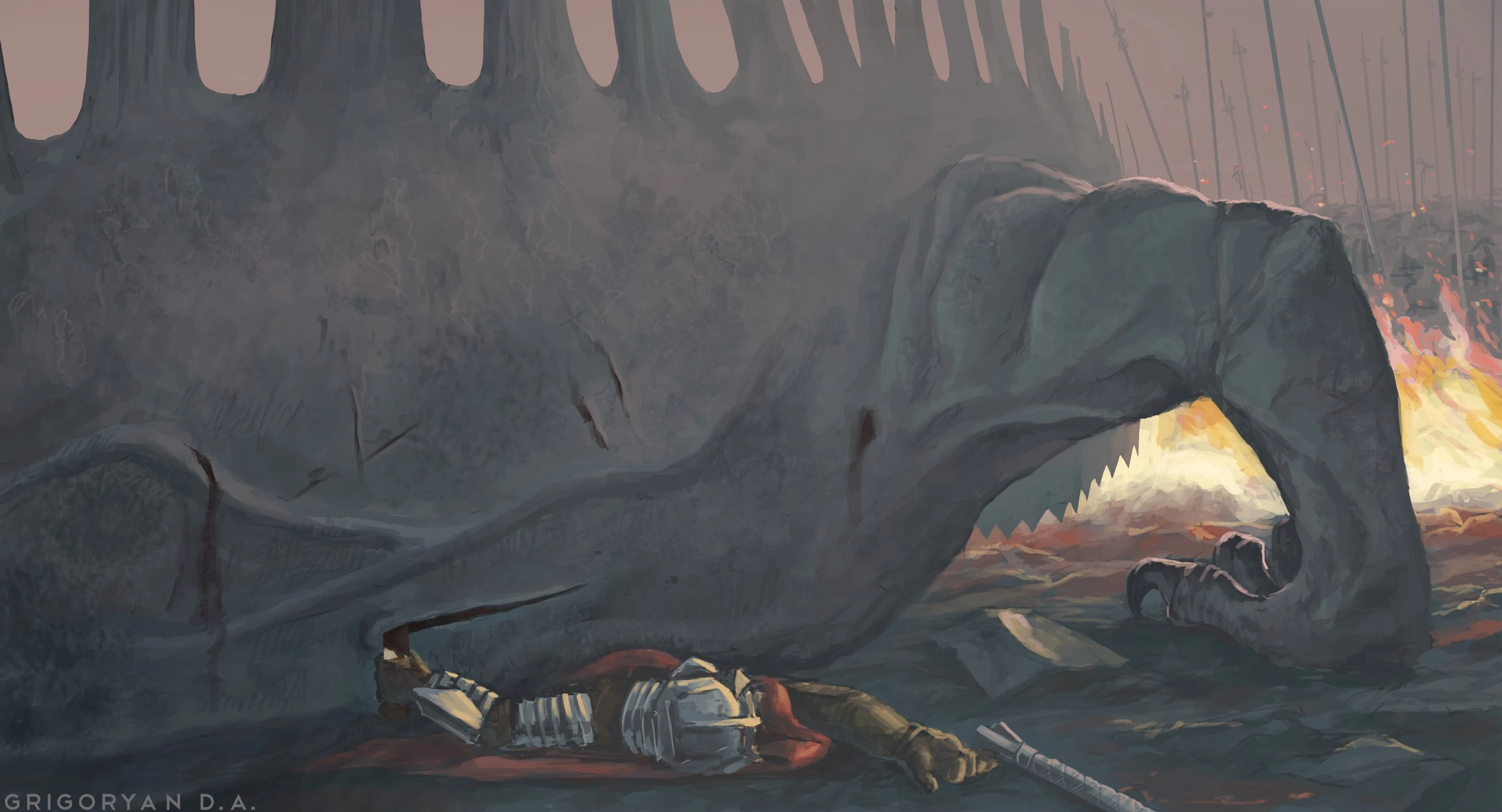 Гномы подняли тело своего владыки, забыв о сражении, и понесли его прочь, низким голосом напевая погребальную песню, будто не было ничего кроме них вокруг; никто не посмел остановить их.