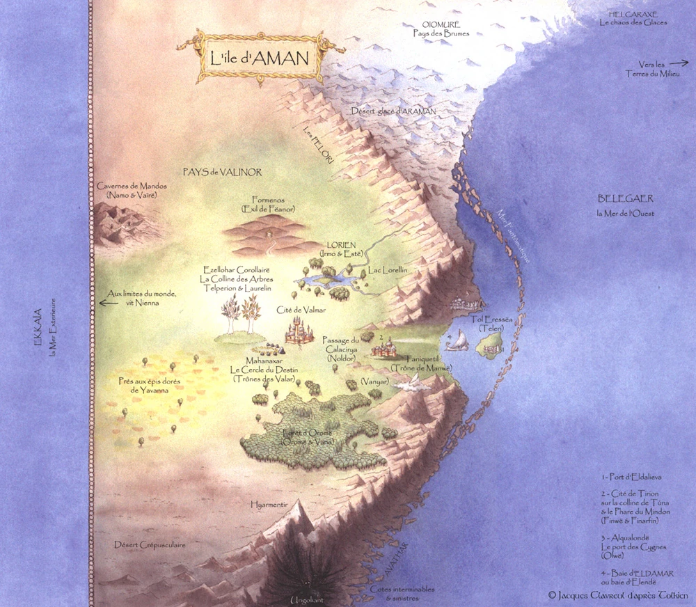На Западе омывается океаном Эккайа, а восточный берег Амана омывает Белегаэр, Великое Западное Море. Валар укрепили своё жилище, воздвигнув на востоке горную цепь Пелори (защита от Моргота). За Пелори Валар основали на обширной равнине своё государство — Валинор — со столицей Валимаром. Лишь узкая полоса берега была на востоке континента за Валинором. Через горы существовал единственный проход — Калакирья. После прихода в Аман эльдар, область их обитания называлась Эльдамар — дом эльфов. Также назывался и залив, в котором находился остров Тол-Эрессеа. На юге находилась пустыня Аватар. На севере находились ледяные горы и пустошь Араман.