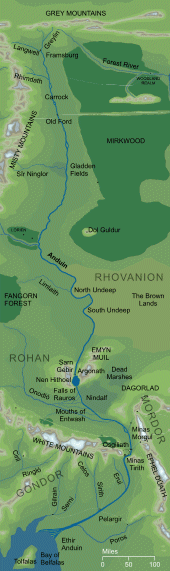 Далее на левом берегу располагаются Бурые земли, а на правом лес Фангорн, из которого вытекает река Энтова Купель, которая впадает в Андуин. Далее идёт Пустошь и Восточная Четь Рохана. Далее идут горы Эмин Муиль, Взгорный Перекат (Сарн Гебир), и Андуин спадает с Водопадов Рауроса. Теперь начинаются земли Гондора по правому берегу и Мёртвые болота по левому. Посреди реки находится островная крепость Каир Андрос. Южнее лежат города Осгилиат (Восточный и Западный, т. к. мосты меж ними были разрушены), Минас Тирит, Лоссарнах и долина Итилиена. Также по левому берегу Эмин Арнен, Южный Итилиен и город Пеларгир. Тут Андуин набирает силу и расширяется в долине Лебеннина. Также в Андуин впадает река Порос.