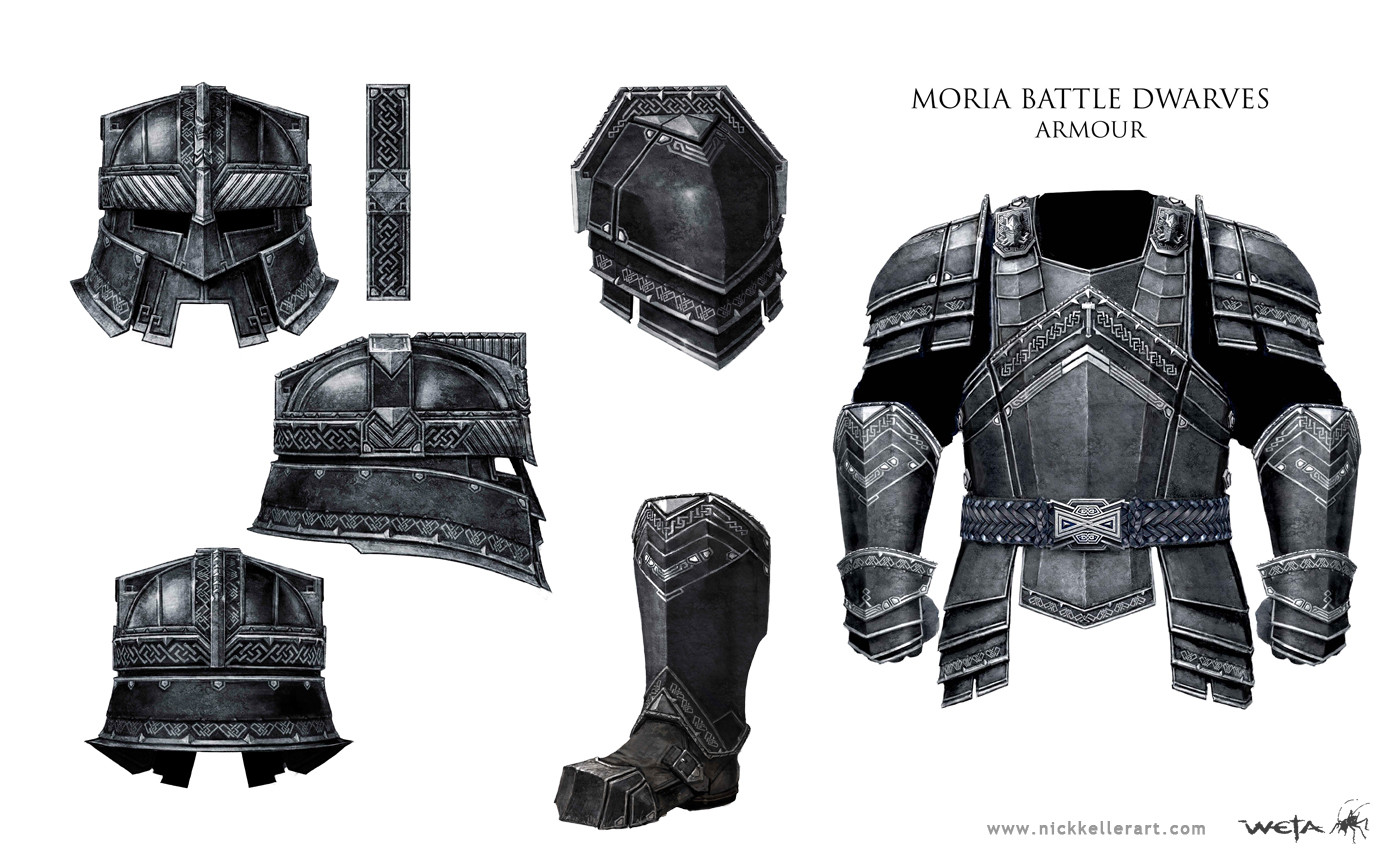 Вообще известно, что развитие оружия у гномов и людей шло параллельно и со взаимопроникновением. Однако, несмотря на это, гномы никогда не пользовались копьями, потому как у самих гномов никогда не было кавалерии, а луками они умели пользоваться очень плохо (достаточно вспомнить эпизод из «Хоббита», когда гномы пытаются подстрелить оленя). Сложно предположить, почему лук был у гномов не в почете. Кроме того, из описания некоторых битв, в которых принимали участие гномы, можно понять, что подгорный народ не выходил в бой строем, предпочитая сражаться небольшими группами. Особое внимание следует уделить гномьим доспехам. Как уже говорилоcь, именно гномы достигли наибольшего мастерства в работе с металлом и именно им приписывается создание такой вещи, как кольчуга. Физически очень сильные, гномы часто надевали на себя очень много доспехов, оказываясь закованными в железо с ног до головы. В описании Битвы Пяти Воинств сказано, что гномы были облачены в длинные, до колен, стальные кольчуги и штаны из гибкой металлической сетки. Кроме того, именно гномы первыми стали употреблять металлические личины. В «Сильмариллионе» говорится, что именно это помогало подгорным воителям выдерживать даже драконий огонь. Видимо, именно от гномьих наличников произошло забрало, так как эльфийские шлемы не закрывали лицо.