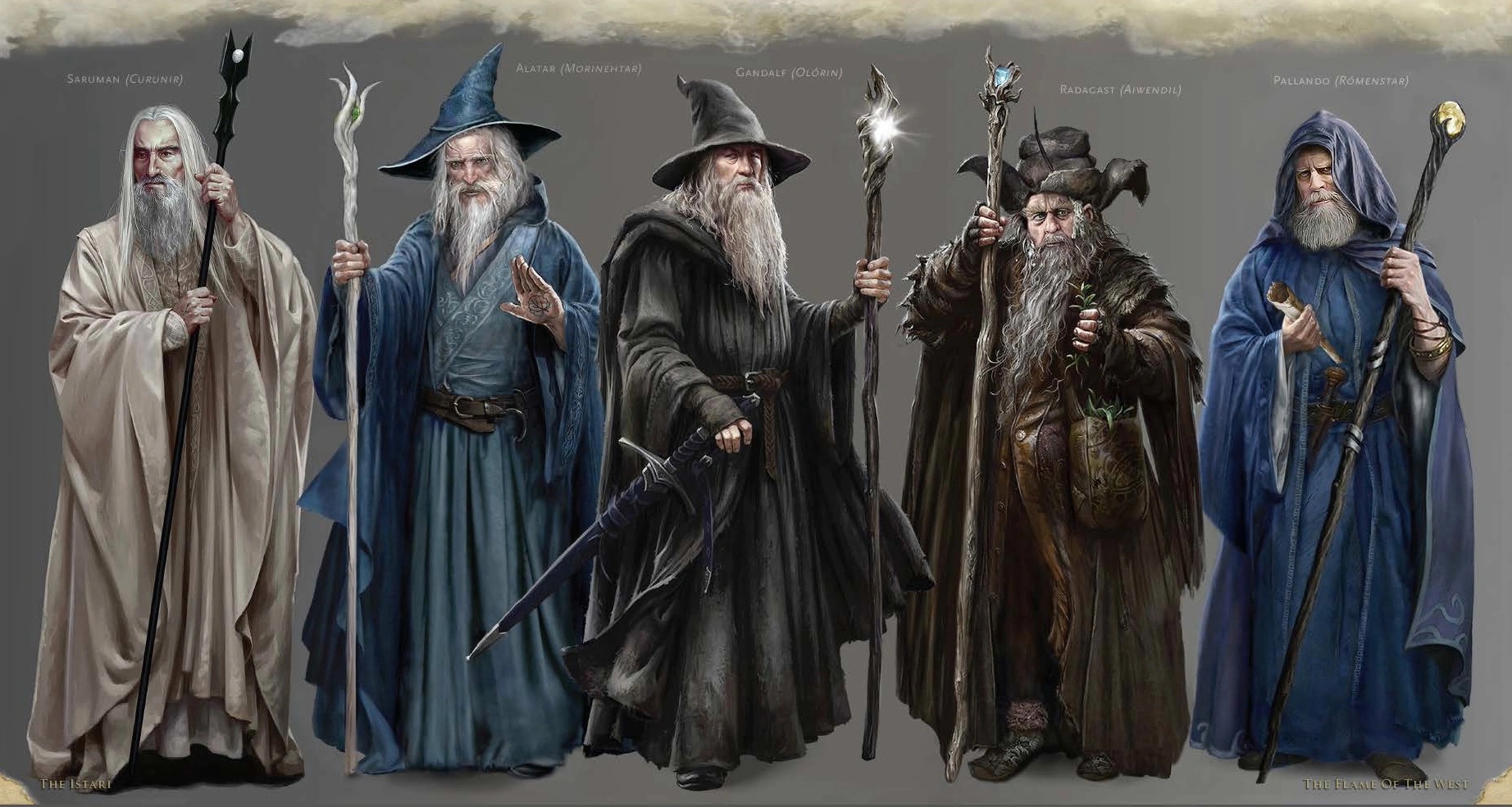 Пришедший первым, имел благородный вид и осанку, волосы цвета воронова крыла и прекрасный голос ― он был одет в белое. Он был искусен в ручных ремеслах и искусствах и почти все, даже Эльдар, считали его главой Ордена. Остальные были: двое в одеяниях синего морского цвета, один в коричневом как земля, один прошёл незаметно, как ветер,