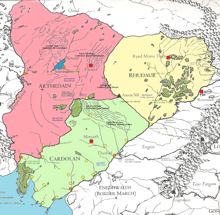 После основания в 861 Т. Э. между тремя королевствами распавшегося Арнора часто происходили раздоры, которые ускорили угасание дунэдайн севера. Главной причиной раздоров были холмы Амон Сула (Заверти) и земли западнее Пригорья. Кардолан и Рудаур желали обладать башней Амон Сул, которая стояла на границе их владений и где хранился главный палантир севера.