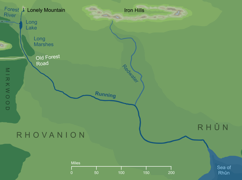 Исток реки находится на склонах горы Эребор. Река протекает через Долгое озеро и сливается с Лесной рекой, вытекающей из Лихолесья. Затем сворачивает на юго-восток через необитаемые, пустынные регионы Рованиона, где сливается с рекой Карнен в Железных холмах и, наконец, впадает во внутреннее море Рун, близ земель Дорвиниона.