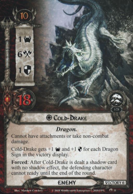 The Cold-Drake's biggest threat to the players are its attack strength and special abilities. The Cold-Drake gains strength with more Dragon Signs in the victory display, which is a catch 22 as more Signs allows for players to deal more damage to it. The best way to defend against it is to either use characters with 4 or more defense (attachment buffs help a lot) or sacrifice a weaker ally. To defeat it, use either many 2-3 attack strength characters or with a few high attack characters. The Cold-Drake can only recieve up to 4 damage each round so it will take a minimum of 5 rounds to defeat it. The Cold-Drake can make an attack to every player at the start of the quest phase so it is important to have strong defenders or many allies as the fight with the Cold-Drake will be a tough one.