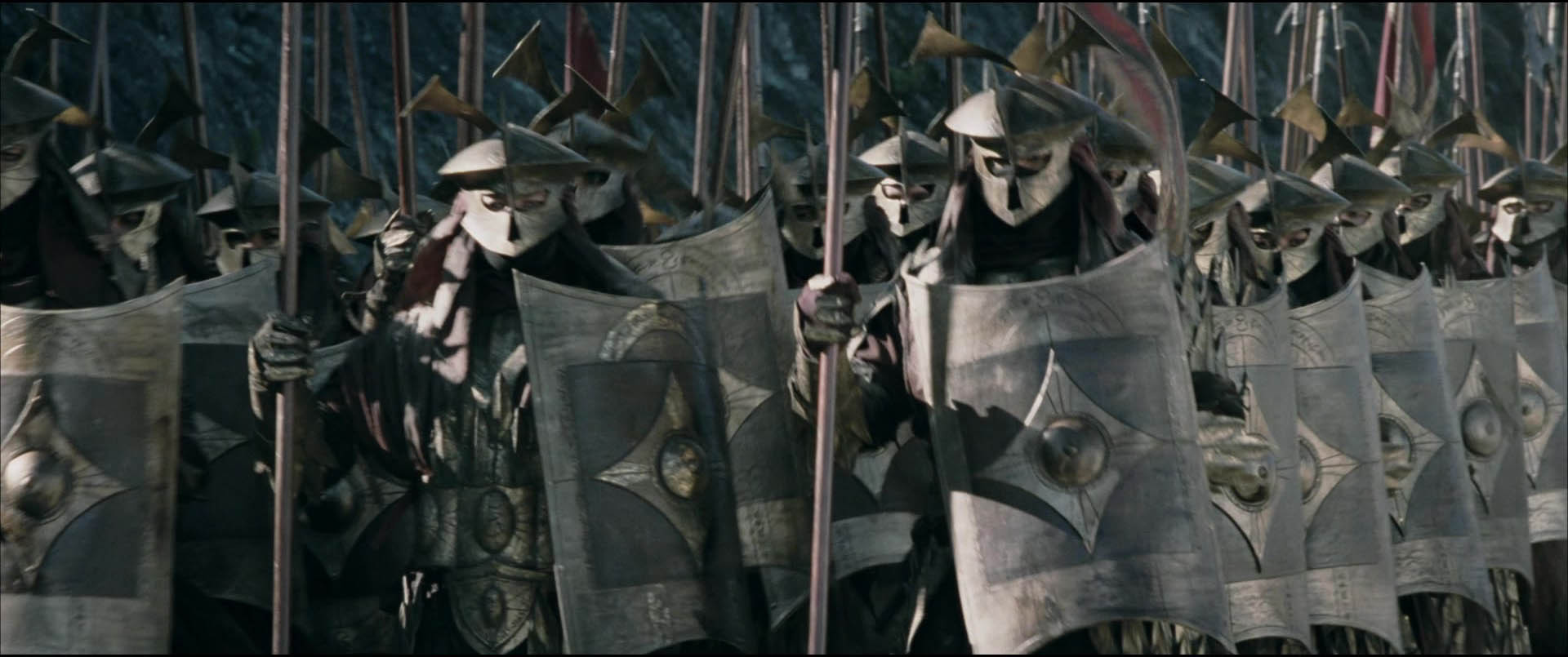 In The Lord of the Rings film trilogy, the armor of the Easterlings entering the Black Gates was made from bronze, along with the helmet; its dragon-skull-shape was made to intimidate enemies.[citation needed]