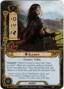 In the actual card game, Elanor would largely be associated with defending, though her score was not that high (at only a 2). Her willpower and attack stats are both at 1, so she would make a slight difference in committing to quests or attacking, but should not be used as the main character to do either. Her low health of 3 warns players against forcing her to defend against opponents with high strength, as it will not take long to finish her off in this case. Her Response effect is extremely helpful against enemies like "Misty Mountain Orcs", who deal 2 automatic damage to 1 character as a "When Revealed" effect. The only downside is that using Elanor's effect leaves you without a potential defender for the round.