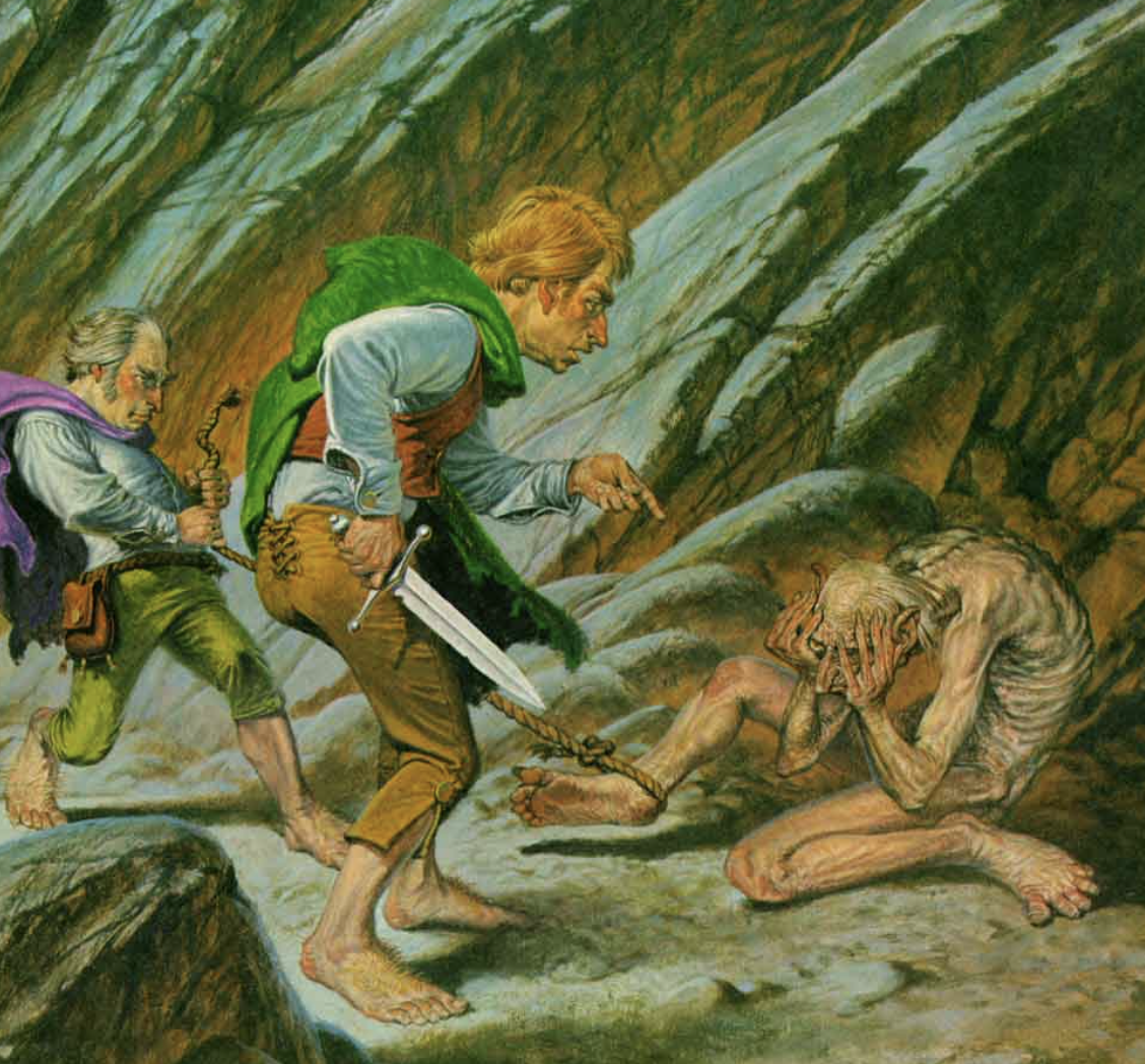 Gollum, captured by Frodo and Sam, in the Emyn Muil - by Darrell Sweet
