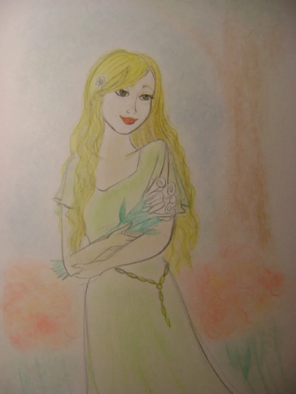 Goldberry was as beautiful and youthful as an Elf-Queen, with long yellow hair that "rippled down her shoulders", fair skin, a clear voice that was "as young and as ancient as Spring, like the song of a glad water flowing down into the night from a bright morning in the hills", and she moved with a "slender grace" that delighted those who observed her. The Hobbits also noted that she was always beautifully-dressed: during their first meeting with her, "her gown was green, as green as young reeds, shot with silver like beads of dew; and her belt was of gold, shaped like a chain of flag-lilies set with the pale-blue eyes of forget-me-nots". Later on, she was "clothed all in silver with a white girdle, and her shoes were like fishes' mail". Frodo went on to reflect to himself that, while Goldberry's extreme beauty and lovely voice were similar to those of the Elves, there was still a remarkable difference, for her charms were "less keen and lofty" than the Elves', but also "deeper and nearer to mortal heart; marvellous and yet not strange".