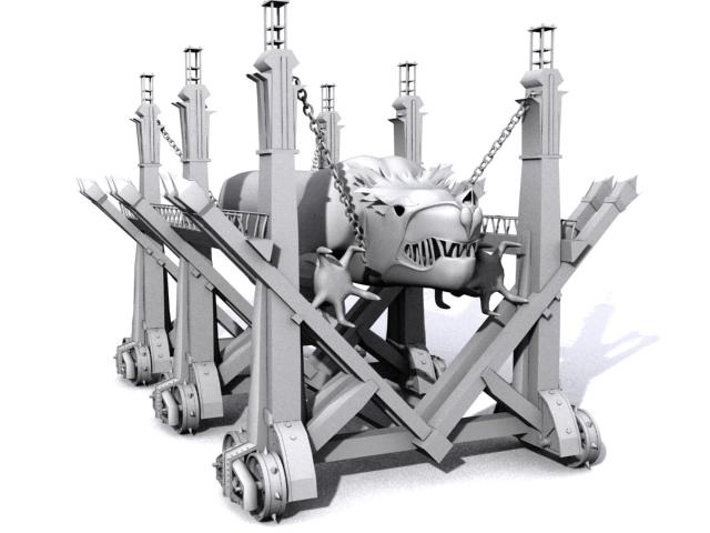 - "Great engines crawled across the field; and in the midst was a huge ram, great as a forest-tree a hundred feet in length, swinging on mighty chains. Long had it been forging in the dark smithies of Mordor, and its hideous head, founded of black steel, was shaped in the likeness of a ravening wolf; on it spells of ruin lay. Grond they named it, in memory of the Hammer of the Underworld of old. Great beasts drew it, Orcs surrounded it, and behind walked mountain-trolls to wield it."