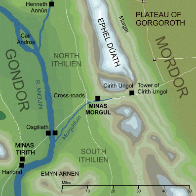 Minas Ithil was established in the upland valley known as the Morgul Vale at the feet of the Mountains of Shadow. It overlooked the region of Ithilien and controlled the only passes through the mountains that led into Mordor, the Morgul Pass and the Pass of Cirith Ungol.[1]