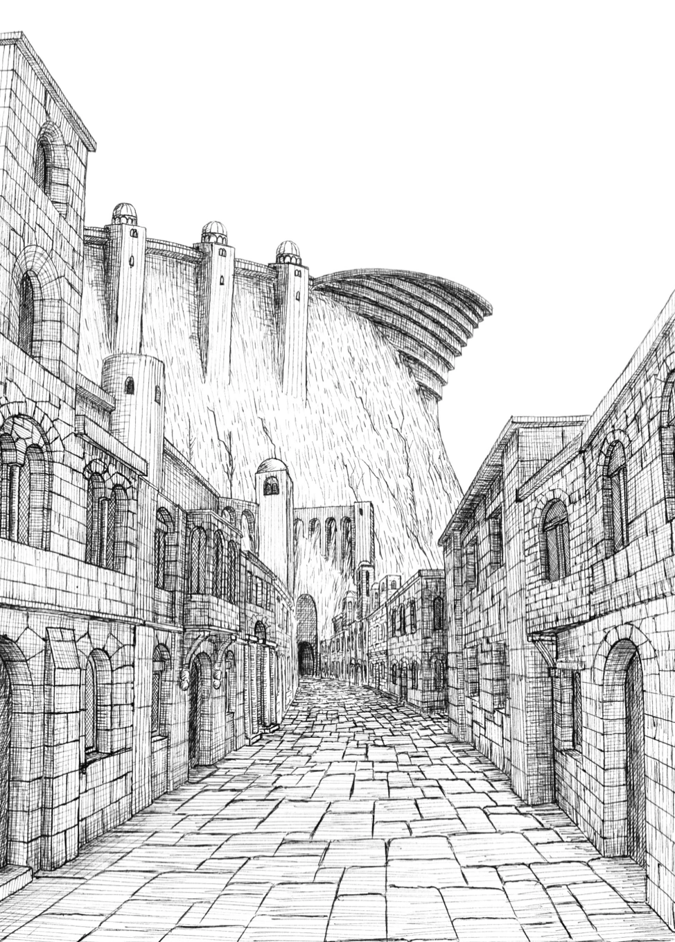 - "For the fashion of Minas Tirith was such that it was built on seven levels, each delved into the hill, and about each was set a wall, and in each was a gate. But the gates were not set in a line: the Great Gate in the City wall was at the east point of the circuit, but the next faced half south, and the third half north, and so to and fro upwards; so the paved way that climbed toward the citadel turned this way and that and then that across the face of the hill."