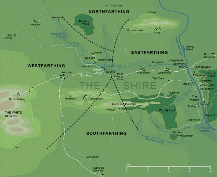 According to the The Atlas of Middle-earth, the region appeared to be the second largest farthing in the Shire and at its widest about 100 miles across.[1]