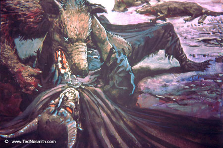 Sauron, as a werewolf, defeated by Huan - by Ted Nasmith