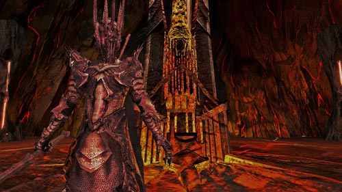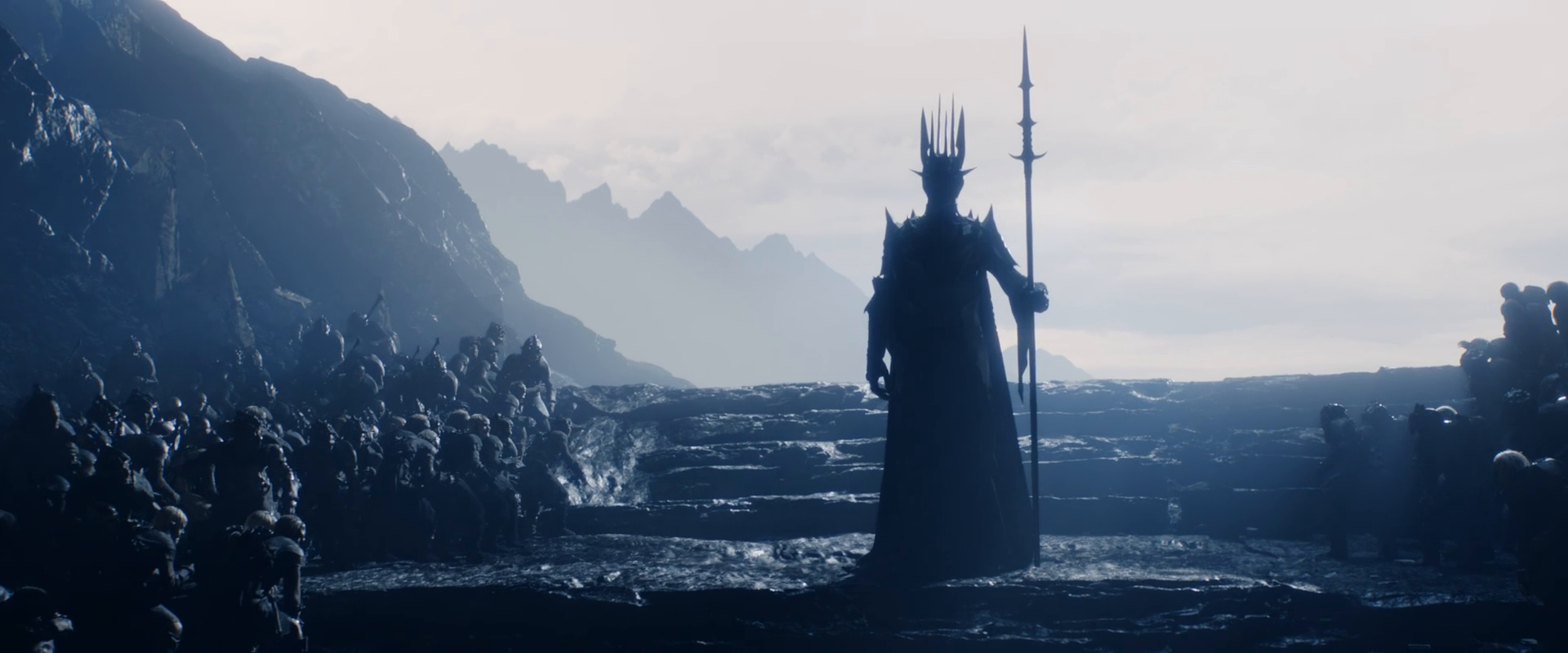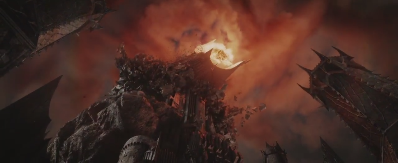 His first appearance is in the form of a black, humanoid ghost, alluding to Tolkien's description of Sauron as a man with blackened skin. When he later emerges from the shadowy mist, Sauron reveals himself in the shape of the Great Eye (similar to the one in Jackson's The Lord of the Rings film trilogy). The slit of the Eye is show as the Dark Lord's armored form, which upon being zoomed in repeats itself in an endless cycle of darkness, suggestive of Tolkien's description of the pupil as a "window into nothing".