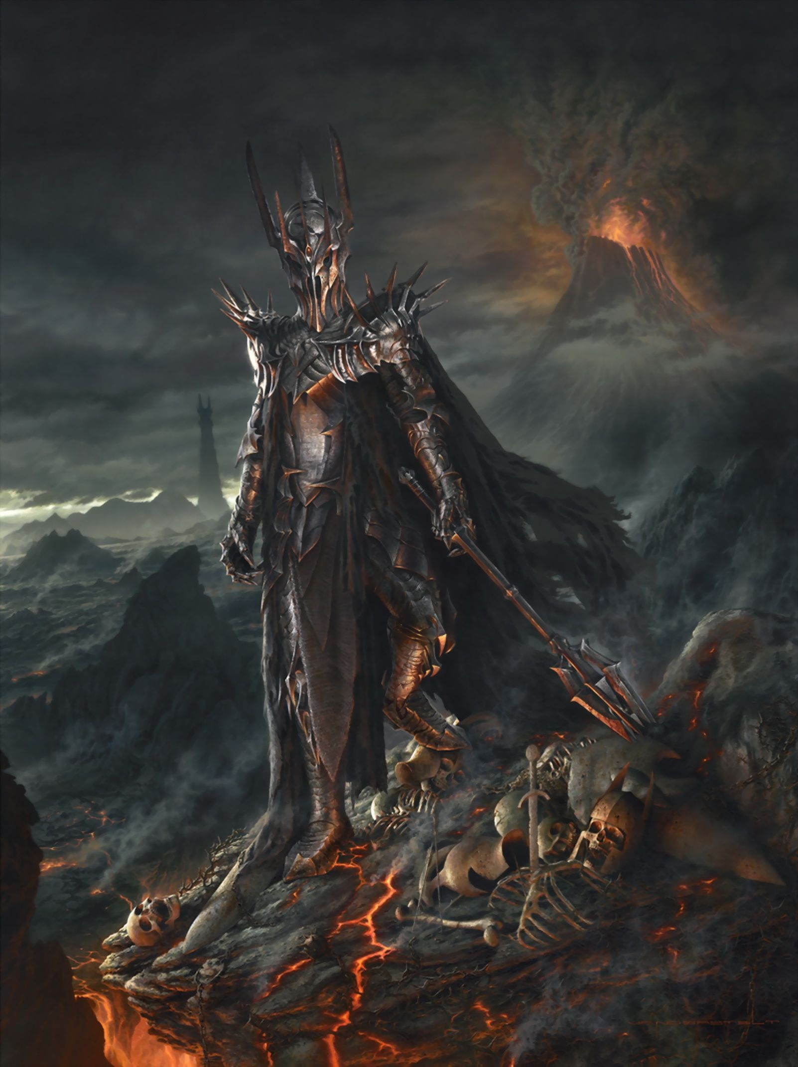In my story Sauron represents as near an approach to the wholly evil will as is possible. He had gone the way of all tyrants: beginning well, at least on the level that while desiring to order all things according to his own wisdom he still at first considered the (economic) well-being of other inhabitants of the Earth. But he went further than human tyrants in pride and the lust for domination, being in origin an immortal (angelic) spirit. Sauron desired to be a God-King, and was held to be this by his servants, by a triple treachery: 1. Because of his admiration of Strength he had become a follower of Morgoth and fell with him down into the depths of evil, becoming his chief agent in Middle-earth. 2. When Morgoth was defeated by the Valar finally he forsook his allegiance; but out of fear only; he did not present himself to the Valar or sue for pardon, and remained in Middle-earth. 3. When he found how greatly his knowledge was admired by all other rational creatures and how easy it was to influence them, his pride became boundless. —J.R.R. Tolkien[45]