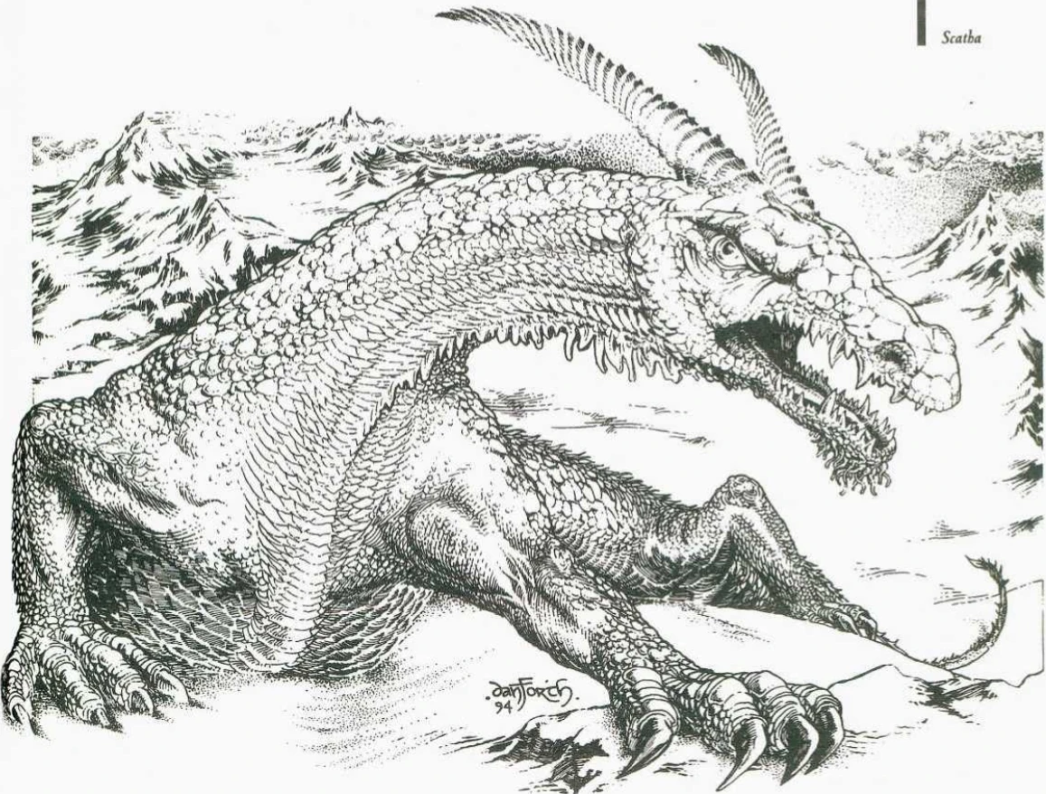 In the Middle-earth Role Playing game, Scatha was the youngest[20] son of Glaurung born in his first brood in Beleriand before the year 495[15] during the First Age.[18] He knew many spells including Calm Spirits, Detection Mastery, Item Lore, Lore, Spirit Mastery, Curses, Black Channels, Dispelling Ways, and Earth Law.[18] After the War of Wrath, Scatha was the eldest[18] of Glaurung's surviving offspring[18] and soon took to roaming the Northern Waste during the Second Age before making a lair in the Grey Mountains. He claimed the title "Lord of the Sintangulóki"[16] and viewed himself as the lord of the Grey Mountains.[17]