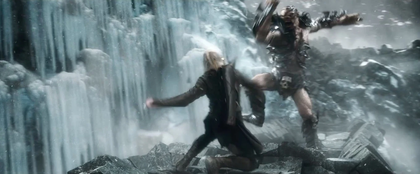 In the other side of Ravenhill, Legolas is shooting arrows at Orcs who are attacking Thorin. When he notices that Bolg is about to kill Tauriel, he attempts to shot Bolg, but he is out of arrows and he is forced to face Bolg with his sword. A Troll is trying to bring down the Tower where Legolas is shooting Orcs. Legolas jumps down onto the Troll and makes him hit the tower with great force. The tower falls near Bolg and the Elf duels with him. A long duel between Legolas and Bolg ensues. On the frozen river, Thorin is fighting Orc Berserkers and their leader attempts to kill Thorin with his mace, but Thorin dodges and stabs the Orc in the neck with his broken sword. The Orc's dead body falls on the makeshift bridge and makes Bolg fall in the bridge's lower level where is trapped by multiple large rocks.