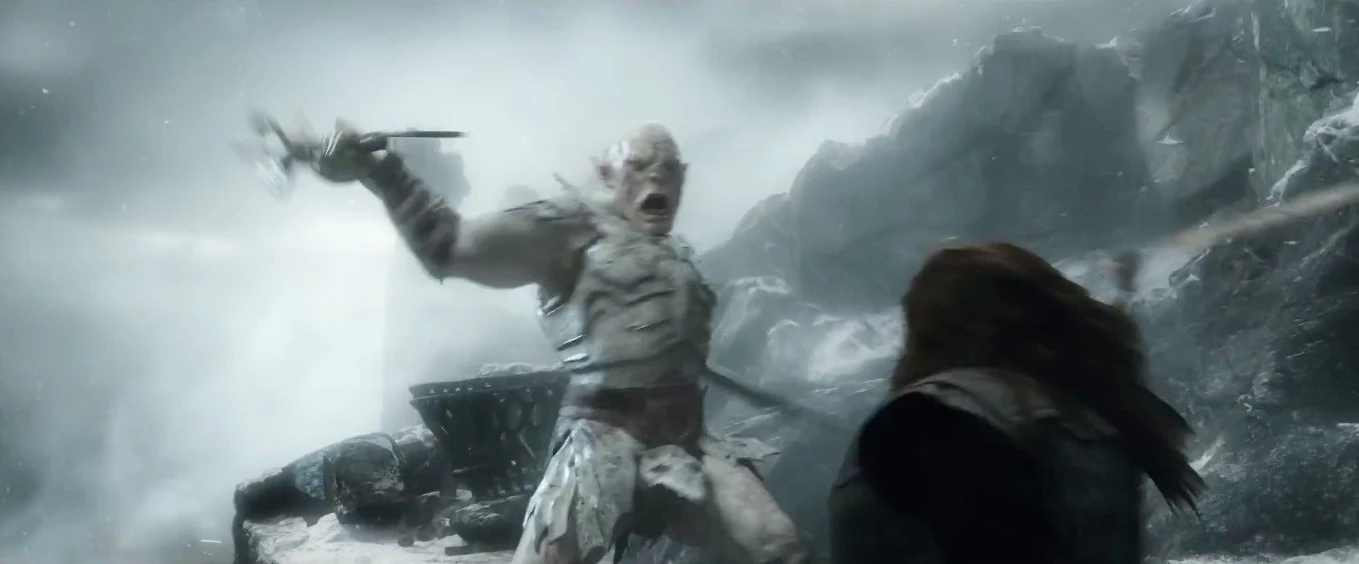 An Orc brute attempts to kill Thorin with an axe. But Legolas saves Thorin by throwing Orcrist in the Orc's chest. Bolg escapes the bridge's lower level and attempts to hit Legolas with his mace. But Legolas dodges and Legolas unsheathes his short swords and attacks Bolg. Legolas and Bolg have a short duel which ends in Bolg's head being impaled by one of Legolas's short swords and his dead body falls off the mountain and is crushed by a falling boulder.