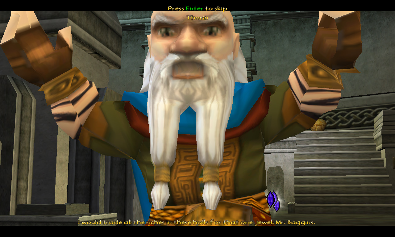 Although Thorin makes no appearance in Peter Jackson's The Lord of the Rings film trilogy, he is mentioned by Gandalf in the extended edition of The Fellowship of the Ring, during the Fellowship's journey through Moria. When the Fellowship passes through a cavern full of mithril, Gandalf tells the others that Bilbo had a shirt of mithril rings that Thorin gave him. Gimli remarks that that was a kingly gift, and Gandalf responds that the shirt was worth more than the whole of the Shire, something he never told Bilbo. This makes Frodo uncomfortable, as he (unknown to the rest of the Fellowship) is wearing the exact same shirt at that moment.